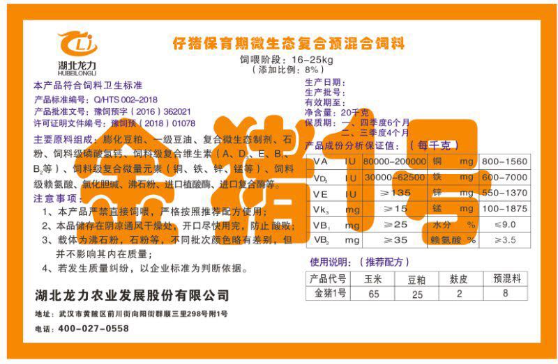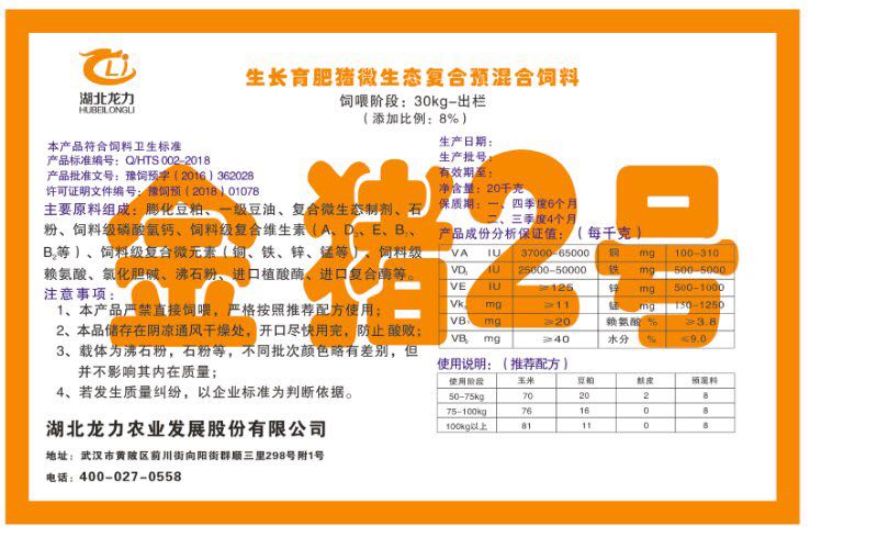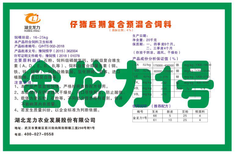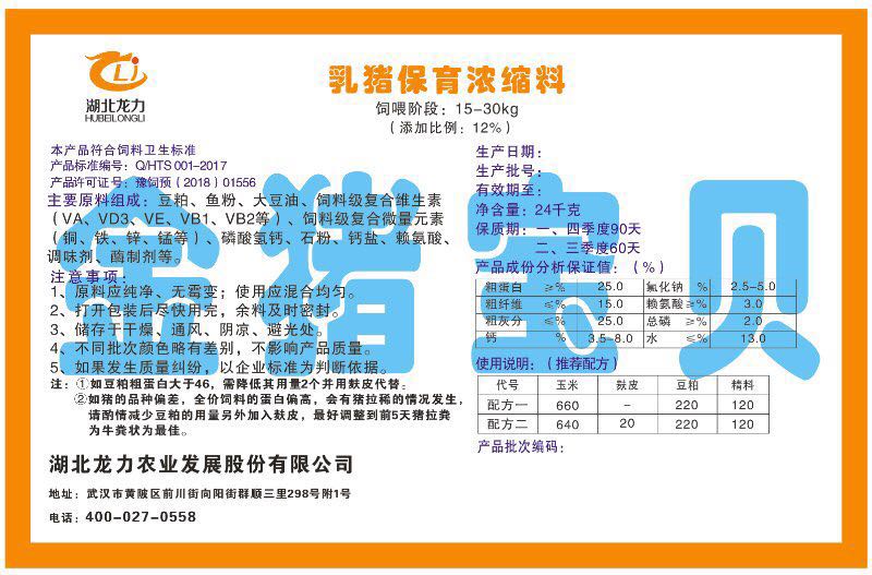 湖北龍力農(nóng)業(yè)發(fā)展股份有限公司坐落于武漢市黃陂區(qū)前川街向陽街群順三里298號附1號。公司成立于2014年6月,公司自成立以來把“創(chuàng)全球最大養(yǎng)豬綜合服務(wù)”為企業(yè)愿景。致力于打造教保料品牌”作為公司發(fā)展的明確目標。公司一直致力于豬營養(yǎng)的研究和開發(fā),積極與國內(nèi)外高校和科研機構(gòu)合作,推廣養(yǎng)豬技術(shù)、動物營養(yǎng)新概念,向世界農(nóng)牧企業(yè)學習與合作。公司采用國內(nèi)先進的生產(chǎn)工藝,選擇高精度電子配料秤,高均勻度、無殘留混合機等先進設(shè)備....